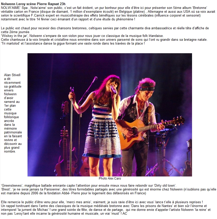 Bretonne (2011 – 2012) Agde Agen Ajaccio Albert Arcachon Arques Aurillac Avranches Biarritz Bobital Bogny-sur-Meuse / Festival Aymon Folk Brest Bruxelles Carcassonne Cavalaire-sur-Mer Chalons-en-Champagne Châteauroux Clermont-Ferrand Colmar Cosnes-sur-Loire Dax Dijon Dôle Enghein Epernay Evry Gap Géménos Genève Grenoble Guingamp Issy-les-Moulineaux La Courneuve La Perrière La Rochelle Landerneau Lausane Le Cannet Le Mans Le Plessis Trévisse Le Touquet Liège Liège Lille Lille Luçon Ludres Luxeuil Macon Marseille Marseille Meaux Mouilleron-le-Captif Moulins Nantes Noisy-le-Grand Olympia Palaiseau Plouezec Porcieu-Amblagneu Pornichet Port-Barcarès Poupet Quimper Ramatuelle Rennes Roanne Saint-Avold Saint-Laurent-de-Cuve Saint-Maurice Saint-Maximin-la-Sainte-Baume Saint-Paul -La Réunion Saint-Sébastien-sur-Loire Salon de Provence Salon de Provence Saugues Spa Strasbourg Tours Valencienne Valognes Vannes Vienne Zénith de Paris